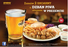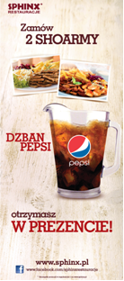 Sphinx – sieć restauracji należąca do Sfinks Polska – wprowadziła nową ofertę, w której zamawiając dwie shoarmy klient otrzymuje w prezencie półtoralitrowy dzban Pepsi. Jednocześnie sieć przedłużyła dotychczasową promocję z gratisowym dzbanem piwa Okocim.